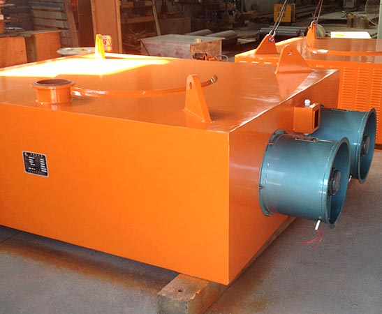 風冷電磁除鐵器,采用空調或軸流風機強迫風冷,增加風道,增大線路與空氣的接觸面積,改善風冷效果。大型除鐵器采用軸流風機,風壓高,風量大,風冷效果強。控制柜采用聯鎖機構,即風機一停,除鐵器勵磁立即停電報警。